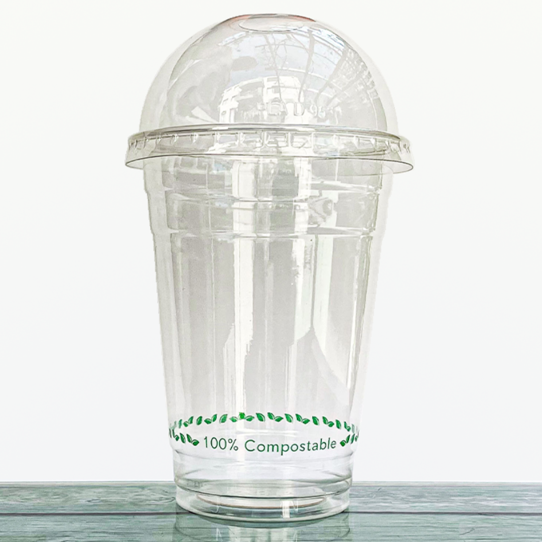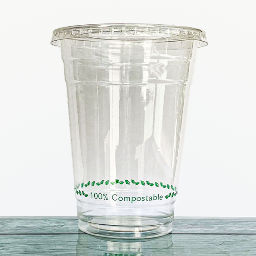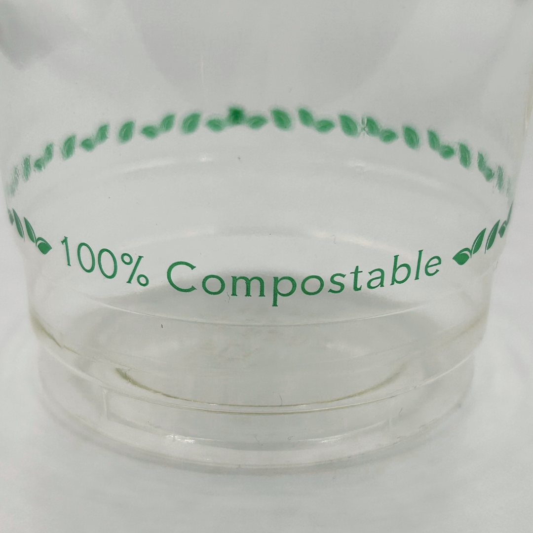 Los vasos compostables PLA transparentes 16oz de Green to Green incluyen una vistosa impresión que muestra a tus clientes la compostabilidad del vaso.