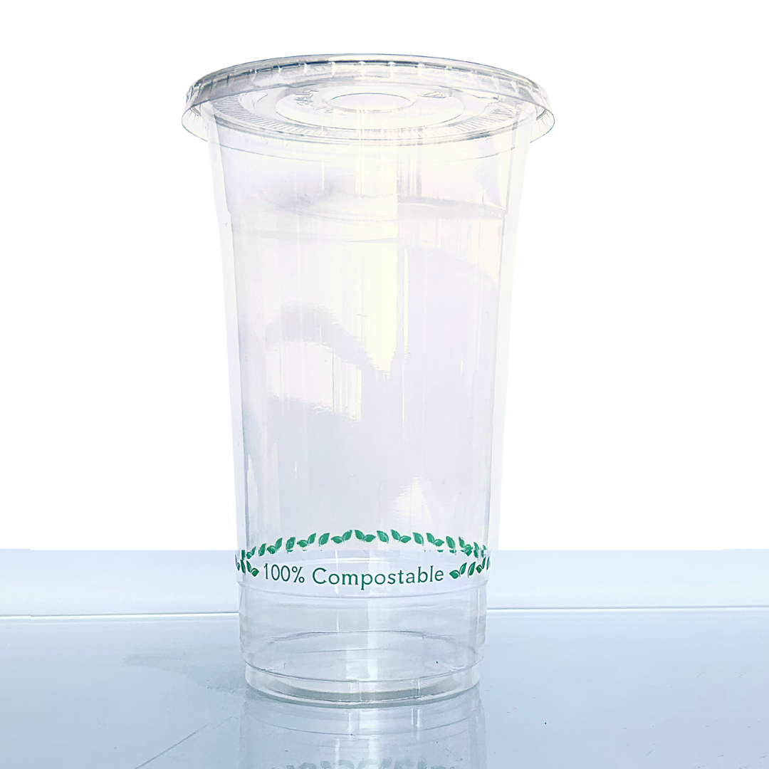 Los vasos compostables PLA transparentes 32oz de Green to Green incluyen una vistosa impresión que muestra a tus clientes la compostabilidad del vaso.
